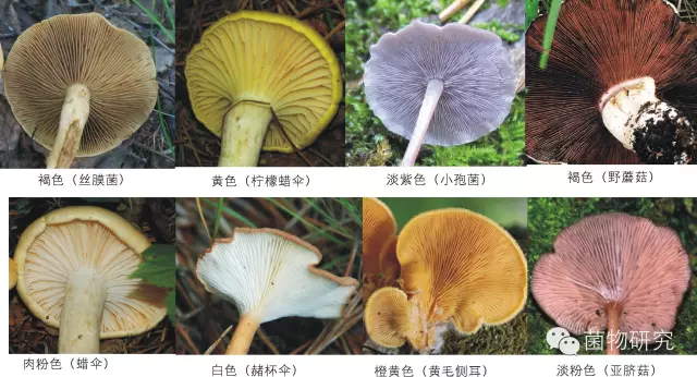 如同菌蓋的顏色,蘑菇菌褶的顏色也是豐富多彩的,也可作為識別蘑菇的輔助特征之一。值得注意的是菌褶的顏色往往和蘑菇的生長階段有關系,更多的和菌褶上所形成的孢子的顏色有有關,一般孢子成熟后顏色加深(如蘑菇)。