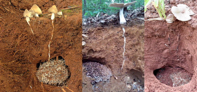 如果白蟻巢體上培養(yǎng)的是雞樅菌的菌絲體,當(dāng)春天來(lái)臨、雷雨過(guò)后,蟻巢上方的土壤含水量增大,形成適當(dāng)?shù)臏夭?、濕差、氣壓差,巢體上就會(huì)形成原基,原基長(zhǎng)高形成假根,假根穿過(guò)巢體上方的空間,進(jìn)入巢體上方的土壤,土壤中含水量適宜,假根很快長(zhǎng)出土面形成菌柄,菌柄頂端形成菌蓋。雨后空氣濕度大,適合菌柄和菌蓋的生長(zhǎng),在土面上就會(huì)突然長(zhǎng)出大量雞樅菌的子實(shí)體。每年的5月至10月,只要我們不破壞蟻巢,不擾動(dòng)、驚嚇白蟻,一個(gè)蟻巢可以連續(xù)出菇4至5批次。營(yíng)養(yǎng)豐富的雞樅菌子實(shí)體為地面上的昆蟲以及人類提供了美味的食物。在一個(gè)很小的干重不到100克的蟻巢體上,就可采集到500克以上的鮮菇,這個(gè)出菇行為會(huì)大量消耗白蟻所需要的營(yíng)養(yǎng)物質(zhì)。